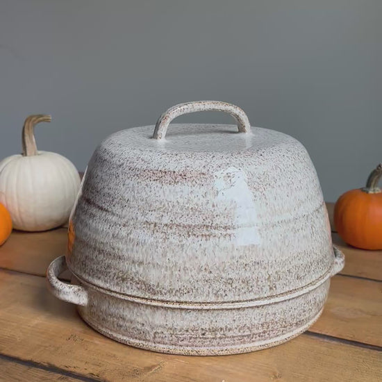 This dish is for baking bread in your oven as well as storing your bread for days after. It was wheel thrown glazed, and fired in my home studio.